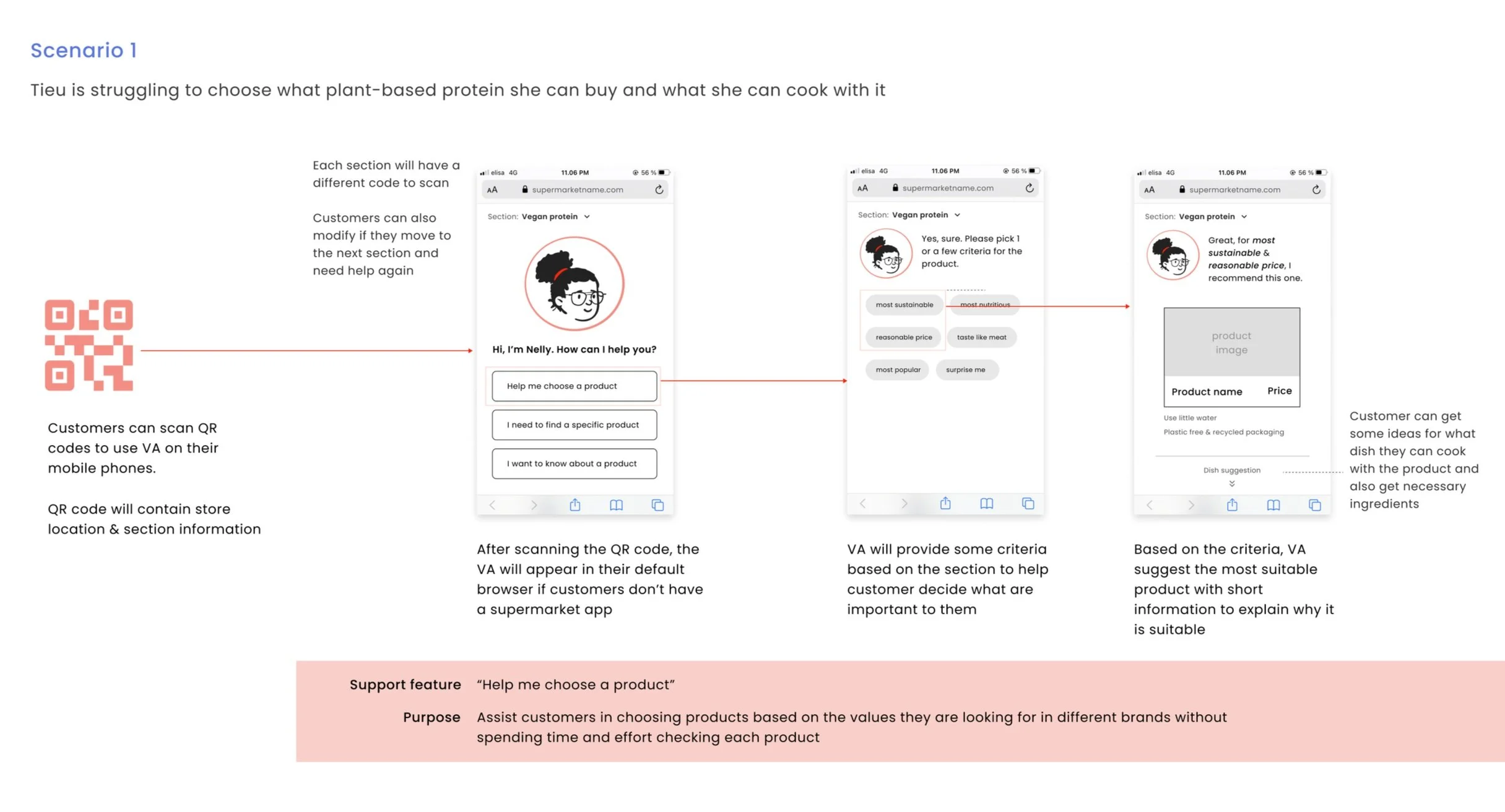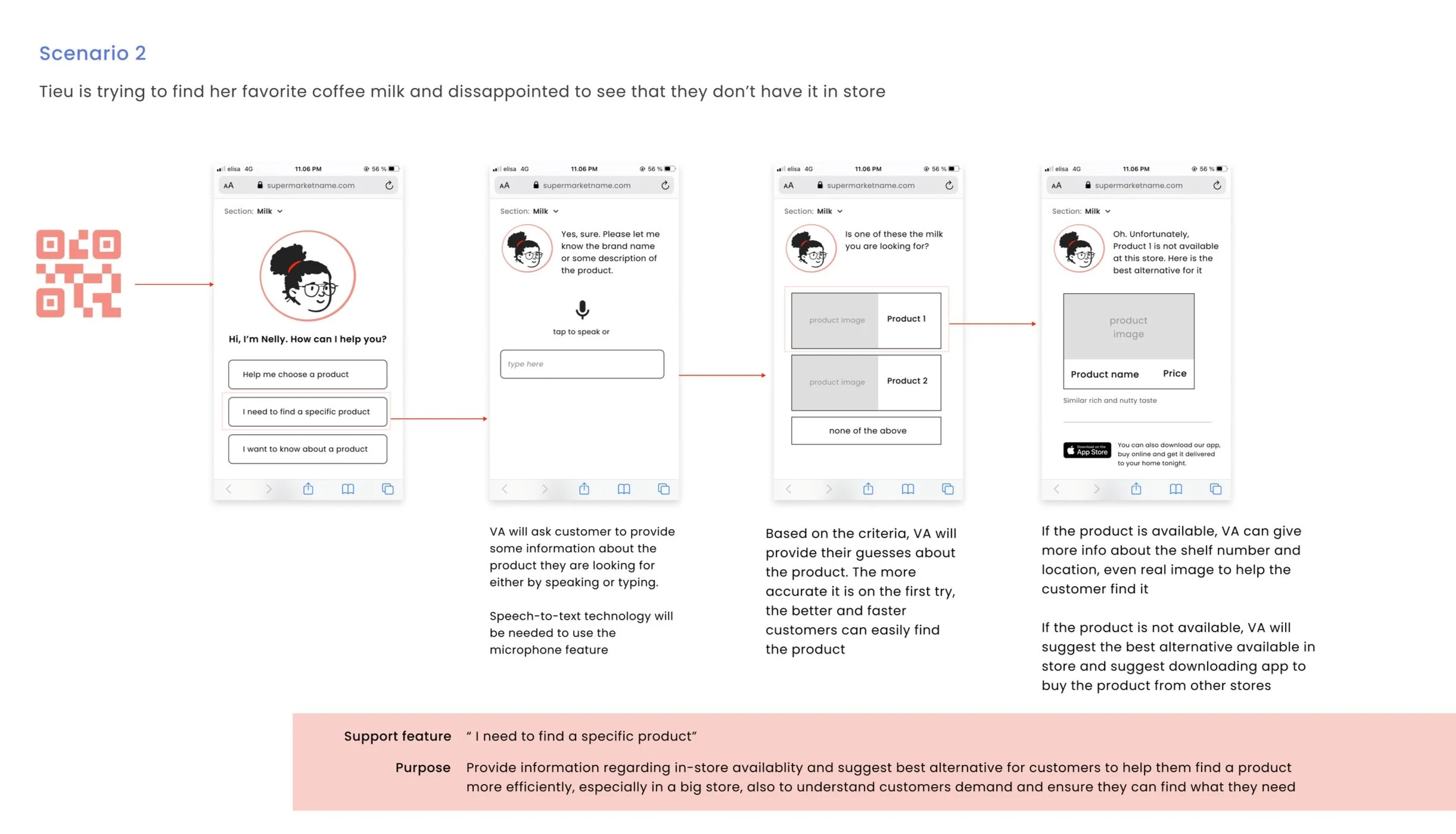 After some ideation, I decided to go with the concept of a virtual assistant providing a hybrid experience at the supermarket that: