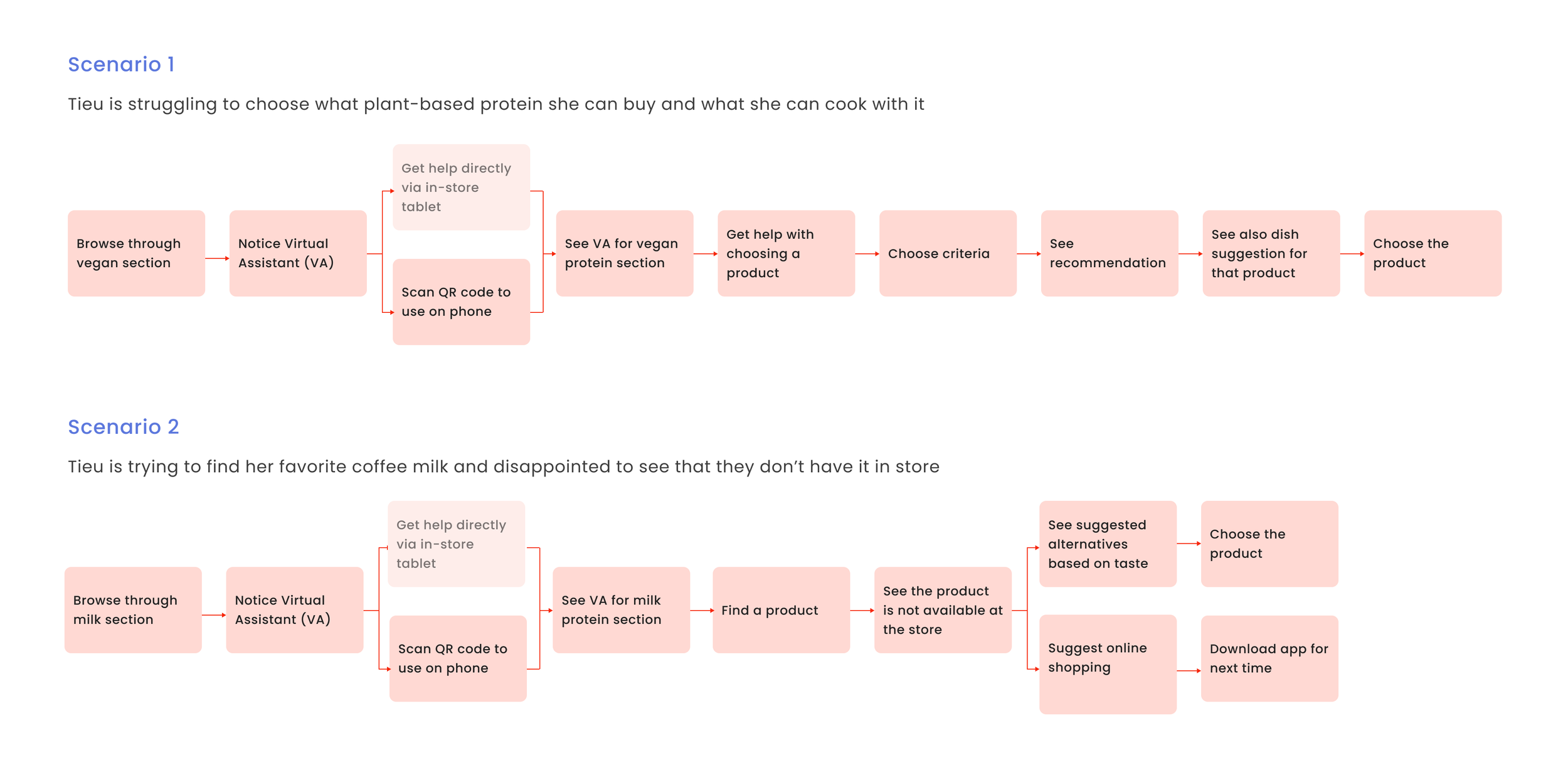 With limited time, I decided to focus on in-store experience and 2 main cases when Virtual assistant will be helpful