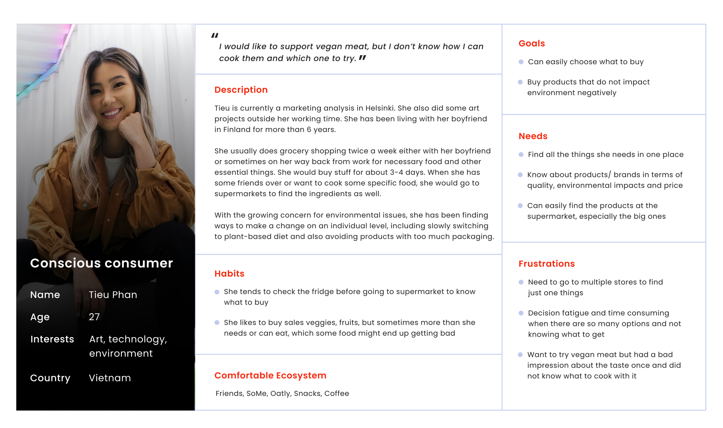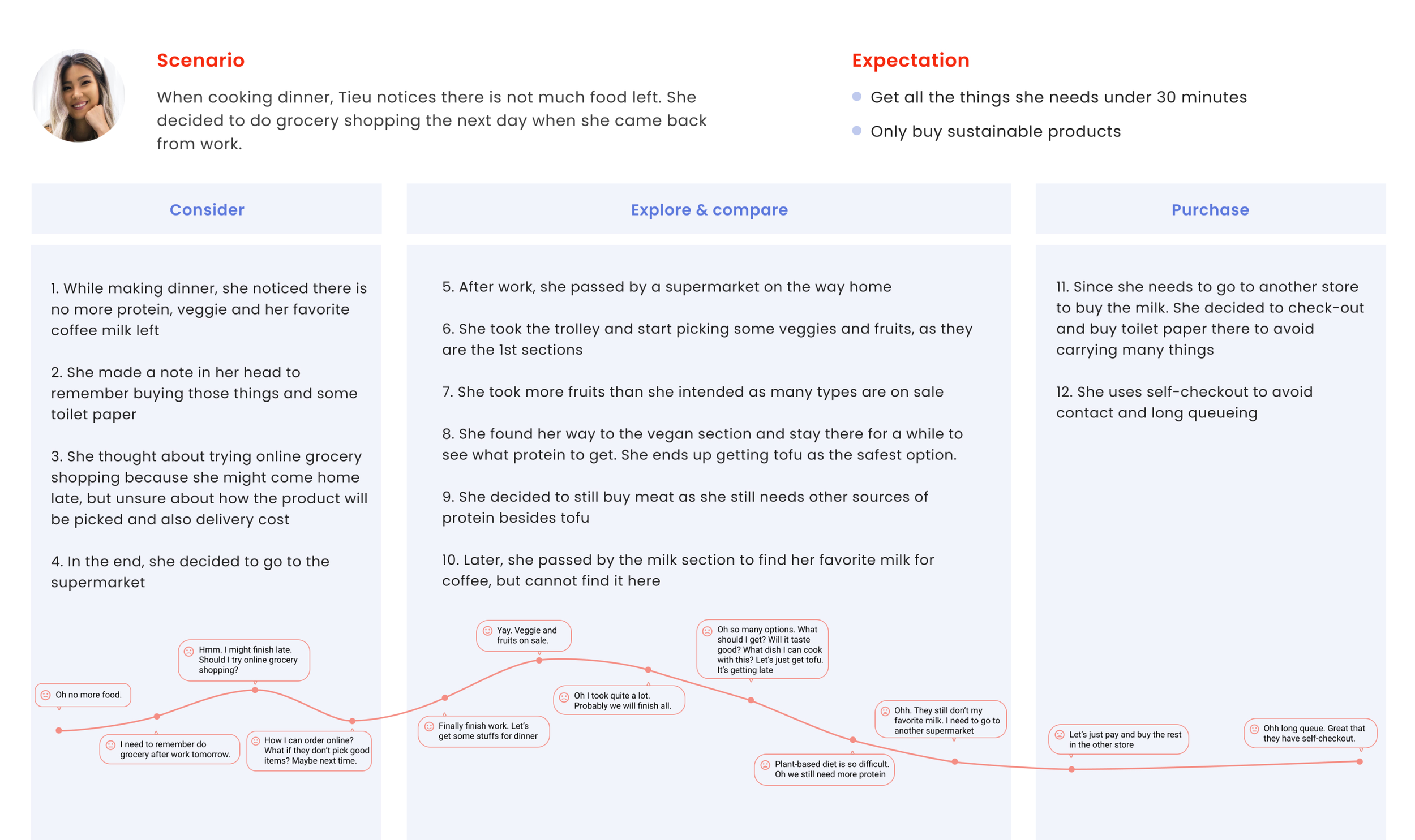 In such a time-limited project, I have learned the importance of a customer journey to understand a holistic view on motivations/needs on when to buy groceries and to zoom-in on different feelings throughout their shopping journey.